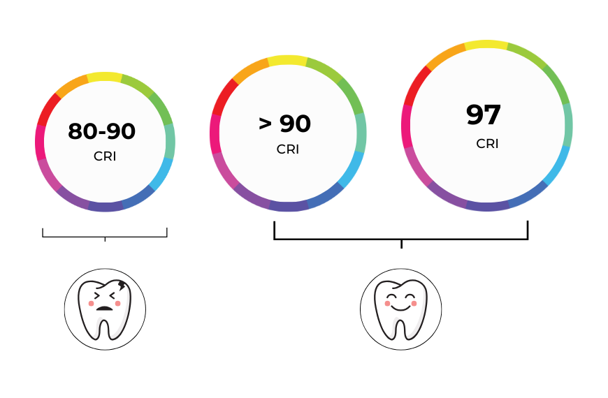 Studien zeigen, dass das die richtige Beleuchtung im Dentallabor einen entscheidenden Unterschied ausmacht. Damit Farben naturgetreu wahrgenommen werden, sind vor allem drei Faktoren entscheidend: die Farbtemperatur, der Farbwiedergabeindex (CRI) und die Helligkeit der Lichtquelle.