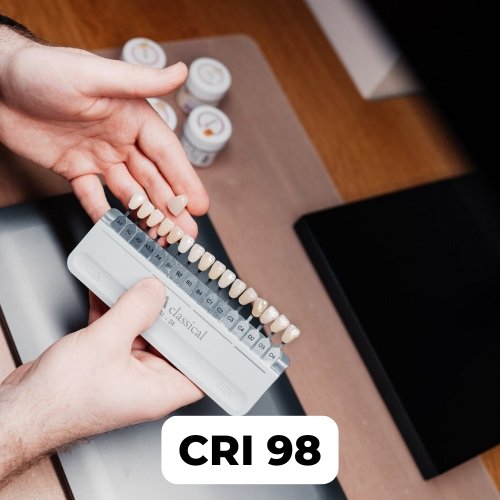 Ebenso wichtig ist der Farbwiedergabeindex (CRI), der beschreibt, wie exakt eine Lichtquelle Farben im Vergleich zum Sonnenlicht (CRI 100) wiedergibt. Hochwertige Leuchten mit CRI 97–98 ermöglichen eine realistische Farbdarstellung und stellen sicher, dass der Zahnersatz zur natürlichen Zahnfarbe passt.