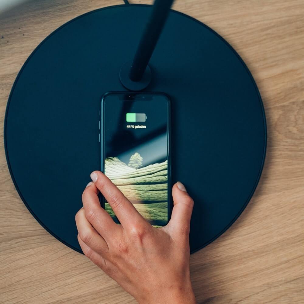 Optional dient die Heavn One Tageslichtlampe durch einen intelligenten Standfuß mit induktiver Ladefunktion als Wireless Charger und lädt das Smartphone sowie andere Geräte bequem am Schreibtisch auf. Um das smarte Erlebnis in Büro und Homeoffice abzurunden, stehen zudem eine App sowie wahlweise ein Luftqualitäts-Sensor zur Verfügung.