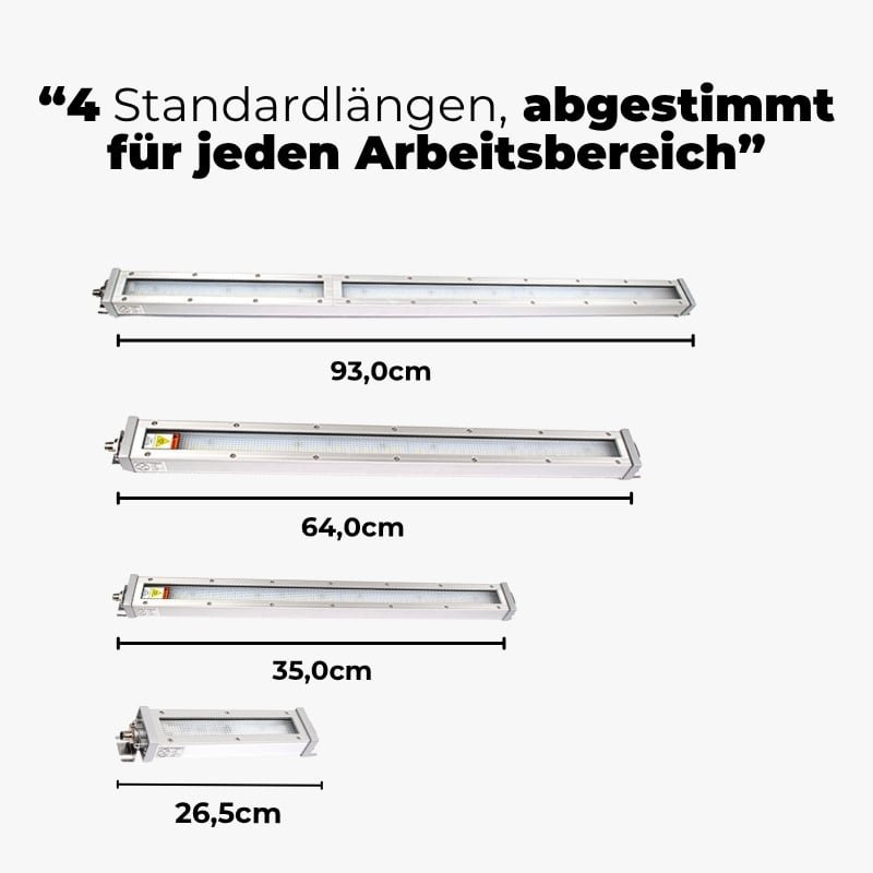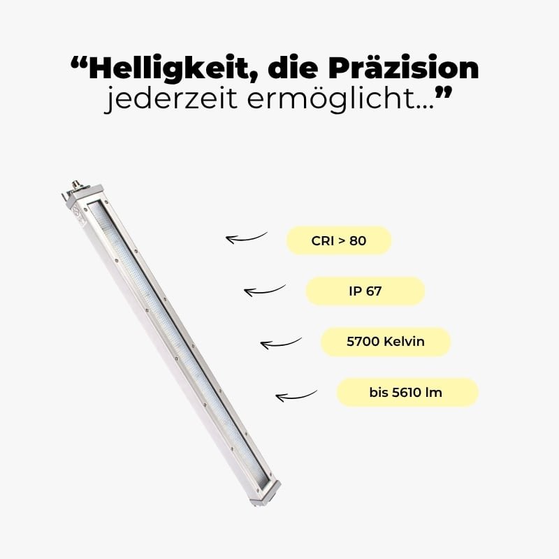 Für industrielle Arbeitsumgebungen ist Tageslichtweiß (etwa 5700K-6000K) ideal. Es sorgt für hohe Kontrastwahrnehmung, präzise Sicht und wirkt aktivierend. Die M‑LED FLAT verwendet genau diese Lichtfarbe – perfekt für die Anforderungen moderner Maschinenarbeitsplätze.