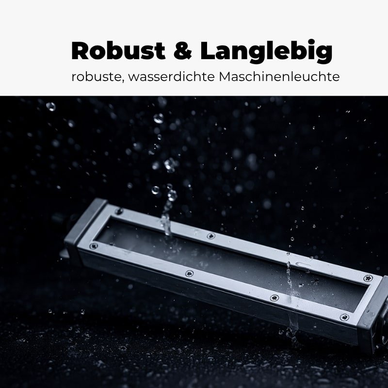 Die Maschinenleuchte ML Flat wurde speziell für den Einsatz in industriellen Maschinenräumen entwickelt. Ihr robustes Aluminiumgehäuse mit ESG-Abdeckung widersteht Staub, Öl, Feuchtigkeit und Vibrationen – zertifiziert nach IP67. Durch ihre flache Bauform (nur 43 mm hoch) lässt sie sich selbst in engen Einbausituationen zuverlässig integrieren. Die LED-Technologie sorgt für flimmerfreies, gleichmäßiges Licht – optimal für visuelle Kontrolle und präzises Arbeiten im Maschinenumfeld.