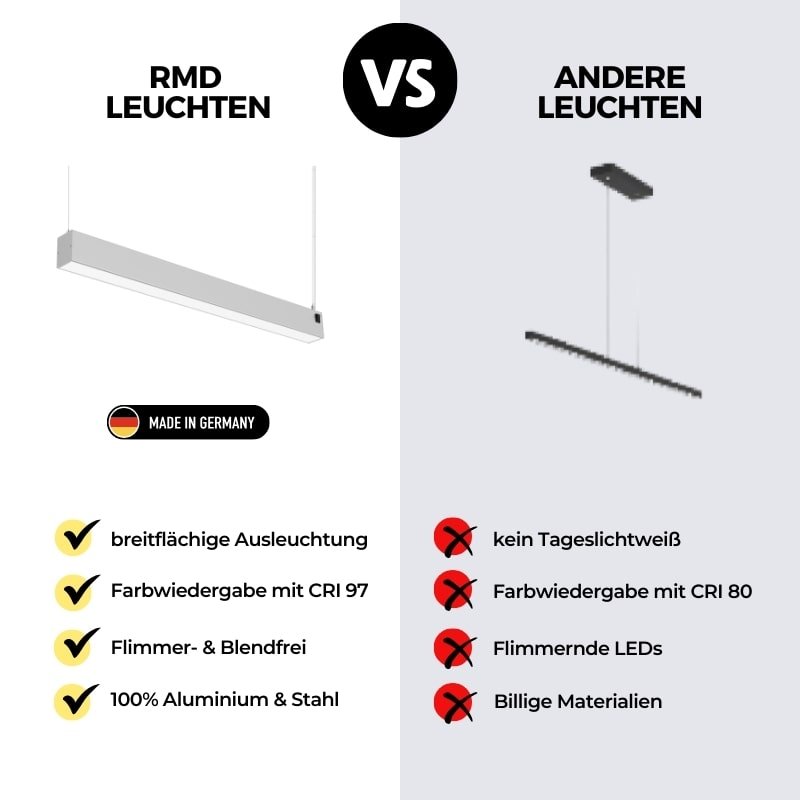Gutes Licht ist die Grundvoraussetzung für Gesundheit & Wohlbefinden beim Arbeiten. Im Gegensatz zu vielen anderen Herstellern am Markt setzen wir auf sehr leistungsstarke und hochwertige LED-Module. Sie sorgen für beeindruckende Lichtqualität und flimmerfreies Licht am Arbeitsplatz. Mit der Installation direkt über dem Arbeitsplatz sorgen unsere LED Pendelleuchten nicht nur für eine gezielte Beleuchtung der Arbeitsfläche, sondern auch für eine optimale Aufhellung des ganzen Raumes.
