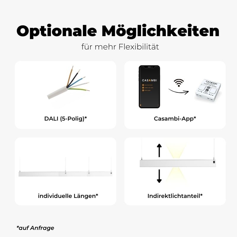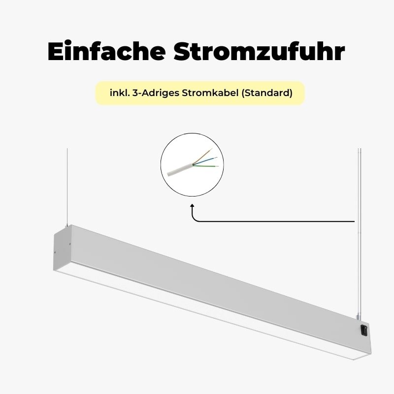 Wichtig: Bei Stahlseilabhängung sollte die Leuchte zusätzlich immer dimmbar sein, um den Ansprüchen der jeweiligen Anwender in Bezug auf Beleuchtungsstärke gerecht zu werden!