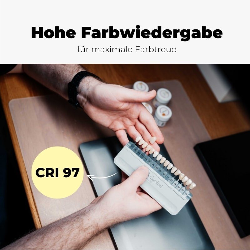 | Farbwiedergabe Die Farbwiedergabe beschreibt, wie natürlich und genau eine Lichtquelle die Farben von Objekten erscheinen lässt. Sie wird mit dem Farbwiedergabeindex (CRI) gemessen, wobei höhere Werte eine bessere Farbdarstellung bedeuten. |