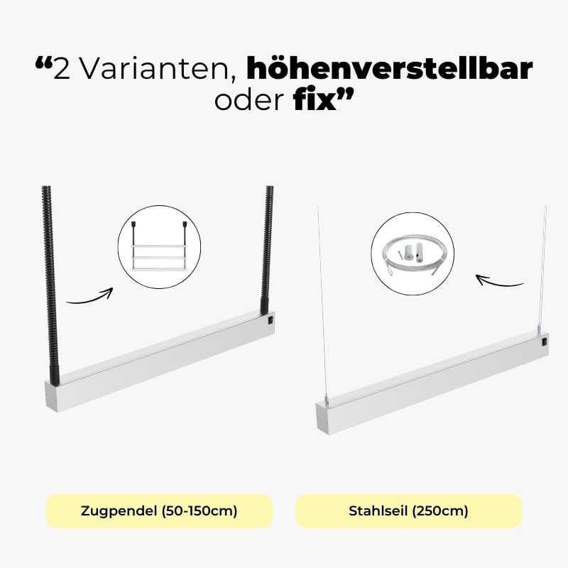 je nach gewählter Option: höhenverstellbare Zugpendel 50-150 cm oder individuell kürzbare Stahlseilabhängung |