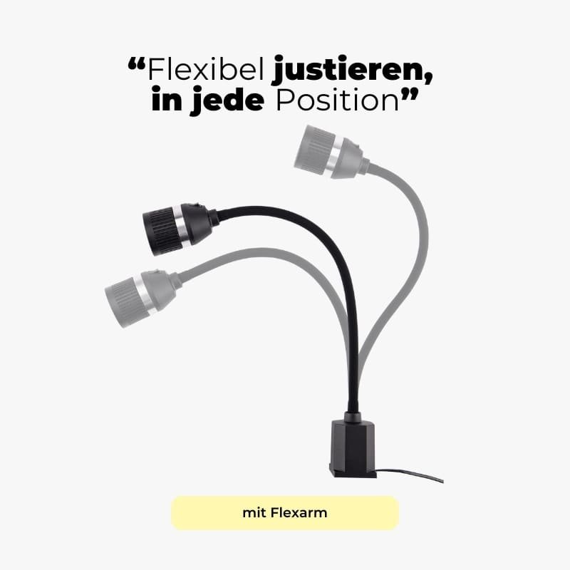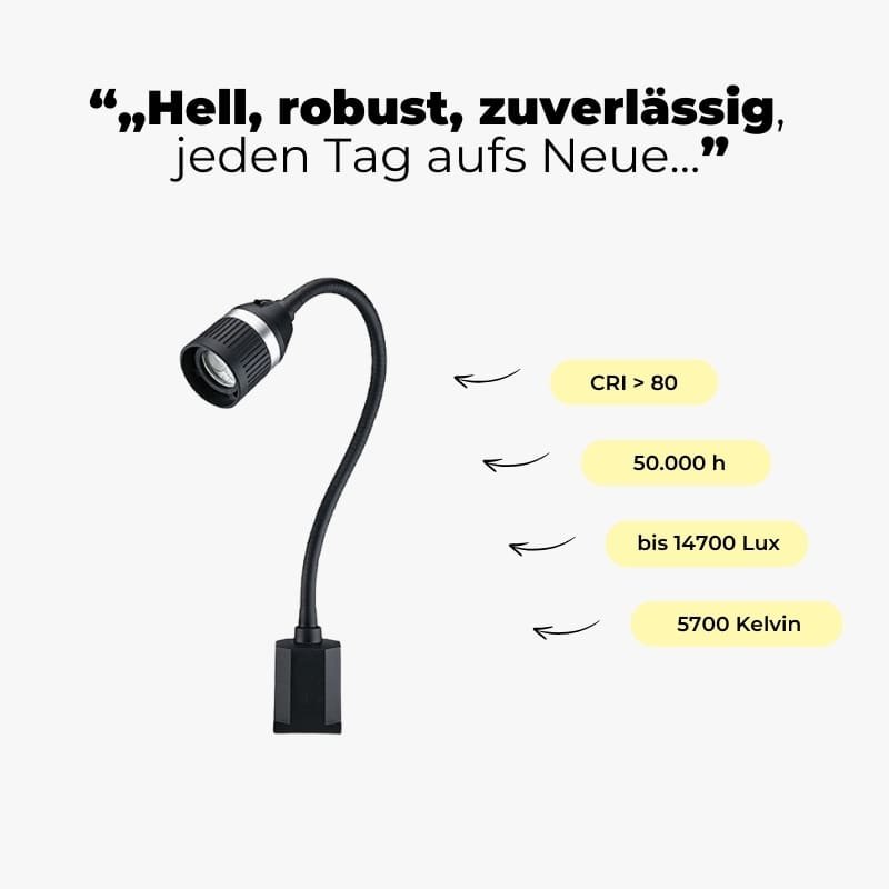 Unsere Flexarmleuchte für Präzisionsarbeiten: Modern und ergonomisch, ideal für breite sowie punktuelle Ausleuchtung.