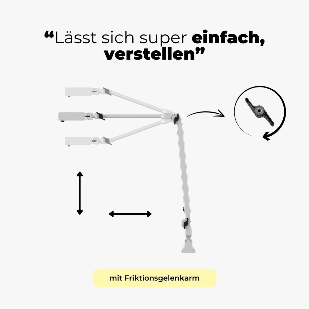 Hochqualitative Bauteile aus natureloxiertem Aluminium vereinen Eleganz und Langlebigkeit. Nicht nur das Leuchten Profil, sondern auch unsere Gelenke sind aus Aluminium gebaut. Im Vergleich zu herkömmlichen Kunststoffgelenken sind diese besonders robust und versprechen eine höhere Lebensdauer der Leuchte.