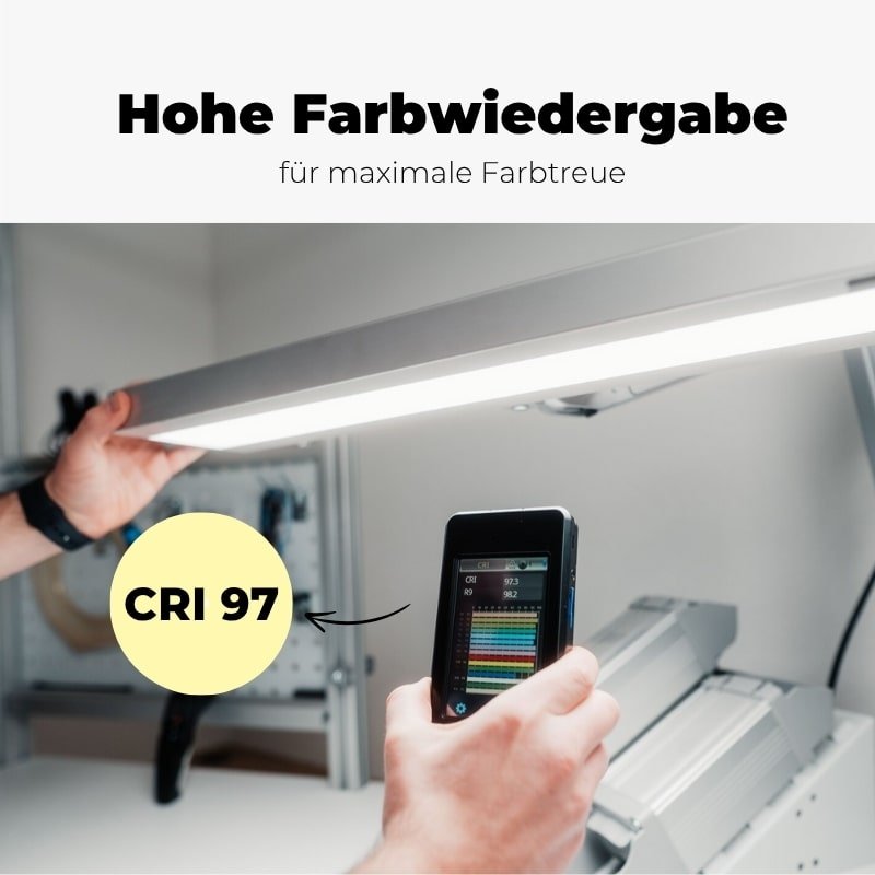 Mit einem exzellenten CRI von 97 zeigt die LED Gelenkleuchte Composite Line Farben, Oberflächen und Übergänge so, wie sie wirklich sind. Die großflächige, schattenfreie Ausleuchtung bringt jedes Detail klar zur Geltung – essenziell für Farbanpassung, Texturierung und Qualitätskontrolle.