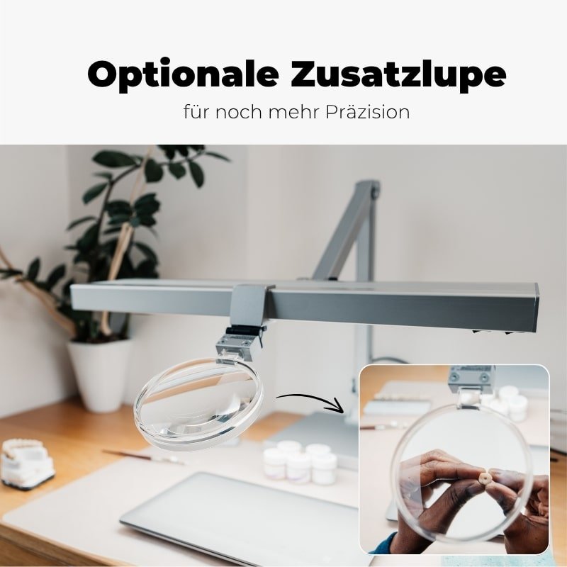 Unsere Leuchte bietet eine einzigartige Kombination aus hoher Farbtreue (CRI 97), gezielter Blaulicht-Reduktion per Tastendruck und einer homogenen, rechteckigen Lichtfläche für schattenfreie Ausleuchtung – perfekt auf die speziellen Anforderungen in der Zahntechnik abgestimmt.