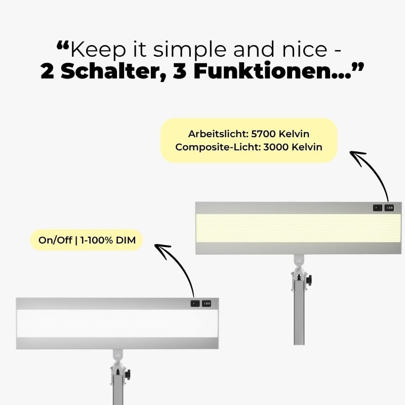 Zwei klar definierte Lichtmodi – Ein helles Arbeitslicht und Composite-Licht – lassen sich per Knopfdruck wechseln. Das sorgt für klare Standards, gleichbleibende Bedingungen und reproduzierbare Ergebnisse an jedem Arbeitsplatz– ganz ohne umständliche Einstellungen oder fehleranfällige Lichtspielereien.
