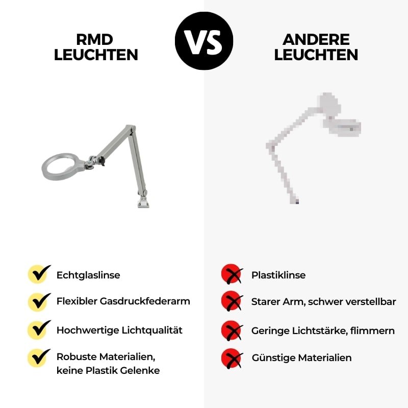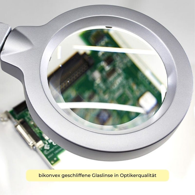 In unseren Lupenleuchten verwenden wir ausschließlich bikonvex geschliffene Glaslinsen in Optikerqualität, also keine optisch minderwertigen Pressglass- oder kratzempfindliche Kunststofflinsen.