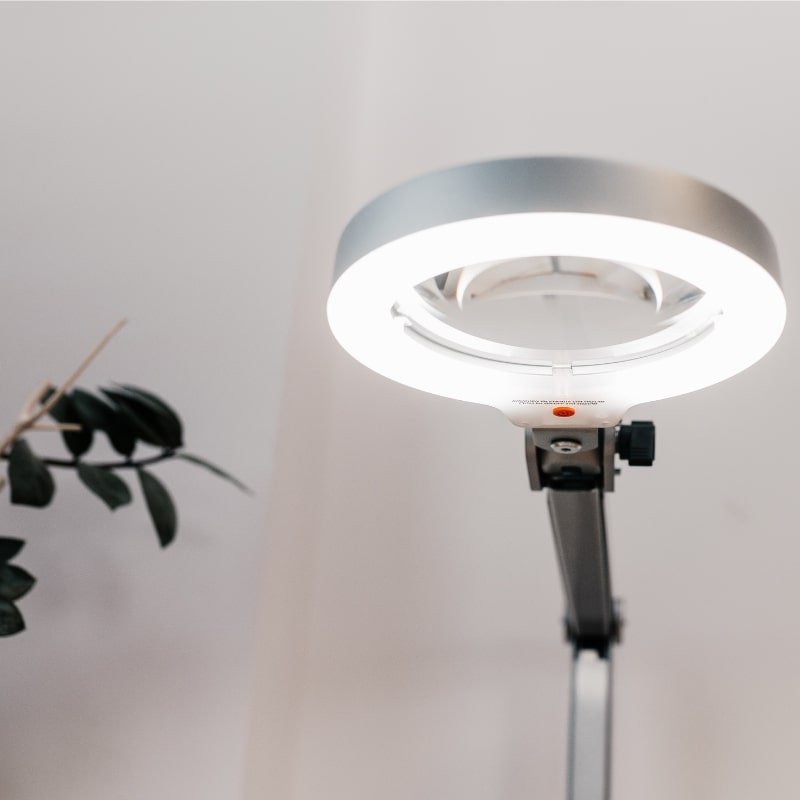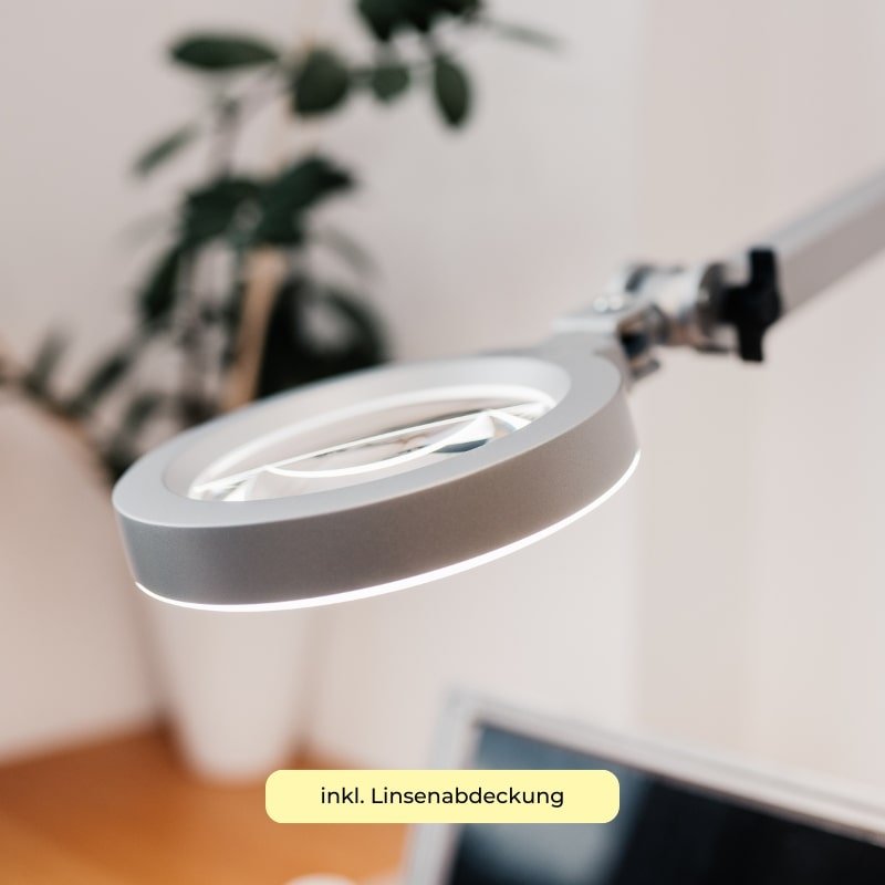 Der optimale Arbeitsabstand zwischen Linse und Objekt ist bei Lupenleuchten mit 3-Dioptrien Vergrößerung in etwa 30 cm. Bei Lupenleuchten mit 5-Dioptrien Vergrößerung empfehlen wir unseren Kunden einen Arbeitsabstand zum Objekt von ca. 18 cm, um kleinste Details im Ausschnitt gut sehen zu können.