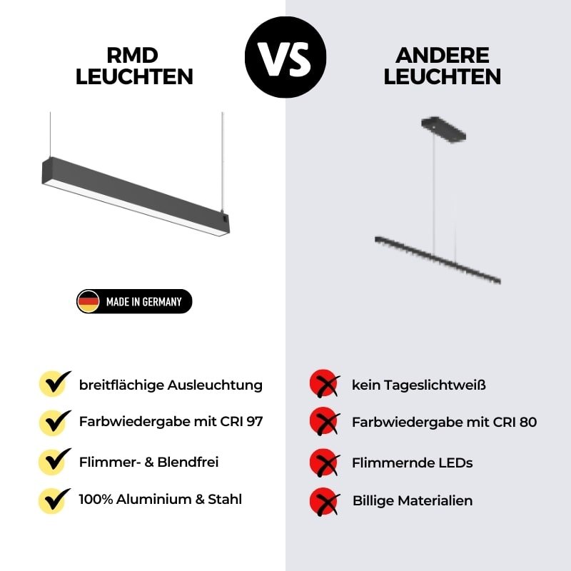 Gutes Licht ist die Grundvoraussetzung für Gesundheit & Wohlbefinden beim Arbeiten. Im Gegensatz zu vielen anderen Herstellern am Markt setzen wir auf sehr leistungsstarke und hochwertige LED-Module. Sie sorgen für beeindruckende Lichtqualität und flimmerfreies Licht am Arbeitsplatz. Mit der Installation direkt über dem Arbeitsplatz sorgen unsere LED Pendelleuchten nicht nur für eine gezielte Beleuchtung der Arbeitsfläche, sondern auch für eine optimale Aufhellung des ganzen Raumes.