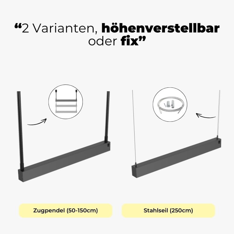 je nach gewählter Option: höhenverstellbare Zugpendel 50-150 cm oder individuell kürzbare Stahlseilabhängung |