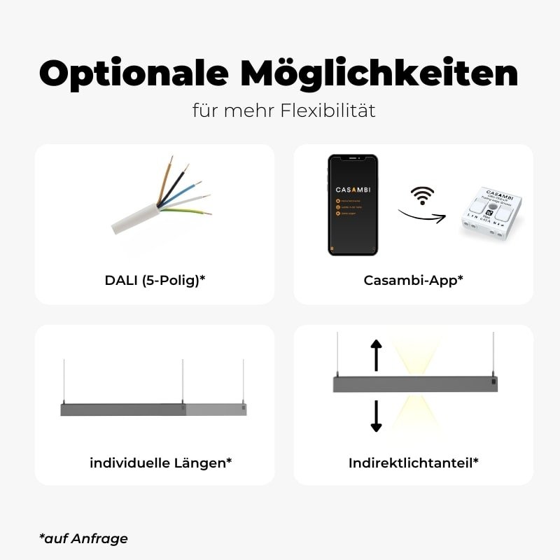 Wichtig: Bei Stahlseilabhängung sollte die Leuchte zusätzlich immer dimmbar sein, um den Ansprüchen der jeweiligen Anwender in Bezug auf Beleuchtungsstärke gerecht zu werden!