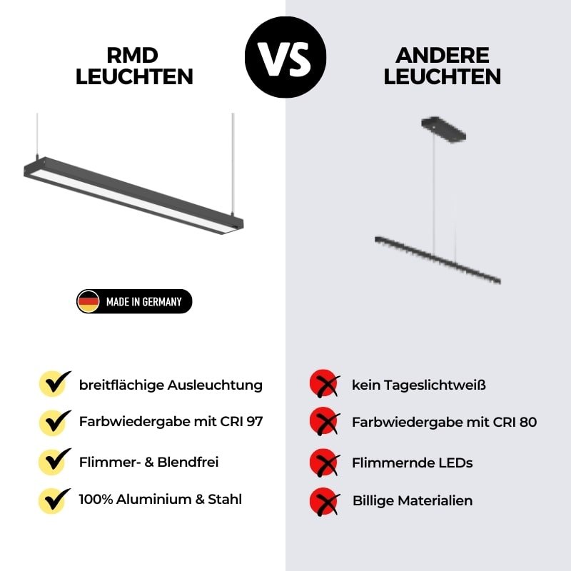 Gutes Licht ist die Grundvoraussetzung für Gesundheit & Wohlbefinden beim Arbeiten. Im Gegensatz zu vielen anderen Herstellern am Markt setzen wir auf sehr leistungsstarke und hochwertige LED-Module. Sie sorgen für beeindruckende Lichtqualität und flimmerfreies Licht am Arbeitsplatz. Mit der Installation direkt über dem Arbeitsplatz sorgen unsere LED Pendelleuchten nicht nur für eine gezielte Beleuchtung der Arbeitsfläche, sondern auch für eine optimale Aufhellung des ganzen Raumes.