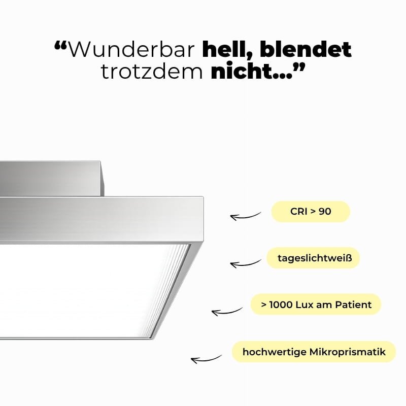 Die neue Beleuchtung hat unsere Arbeitsbedingungen spürbar verbessert. Gerade im Behandlungsbereich ist das Licht jetzt gleichmäßig, blendfrei und sehr angenehm für lange Arbeitstage. Auch optisch wirkt die Praxis deutlich moderner. Eine Investition, die sich definitiv gelohnt hat – sowohl die Planung als auch die Leuchten.