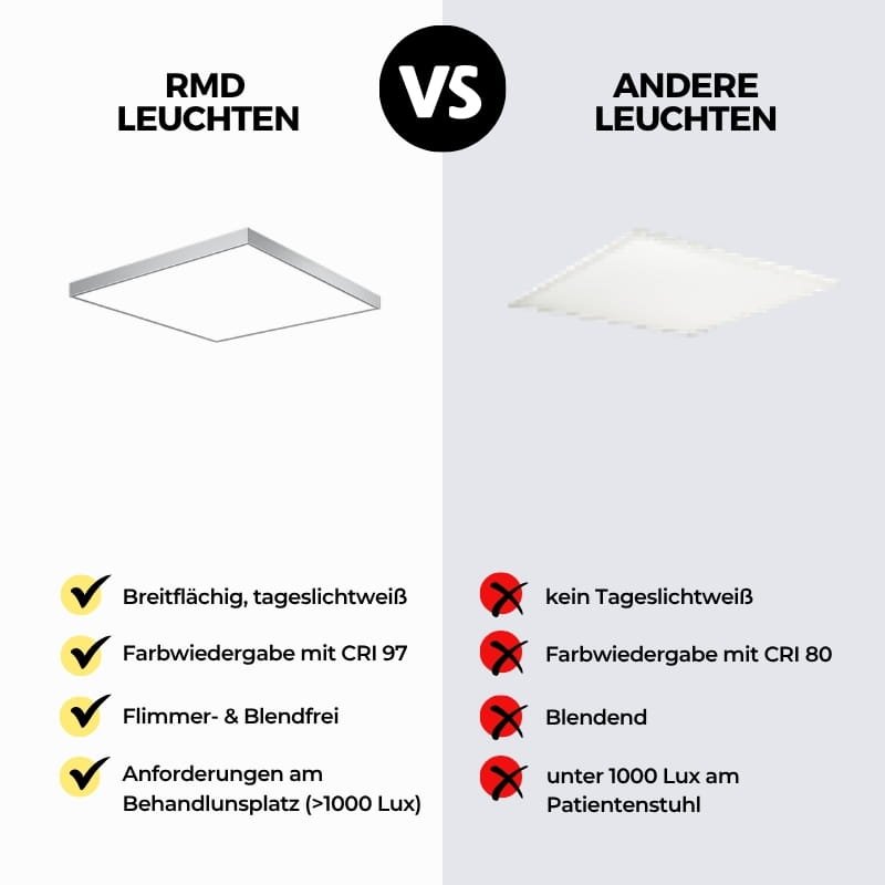 Mit einer Farbtemperatur von Tageslichtweiß wird eine eine natürliche und neutral wirkende Beleuchtung geboten, welche es Zahnärzten ermöglicht, die Farben der Zähne genau zu erkennen und eine präzise Diagnose zu stellen. Darüber hinaus ermöglicht der erhöhte Blaulichtanteil im Lichtspektrum ein ermüdungsfreies Arbeiten.