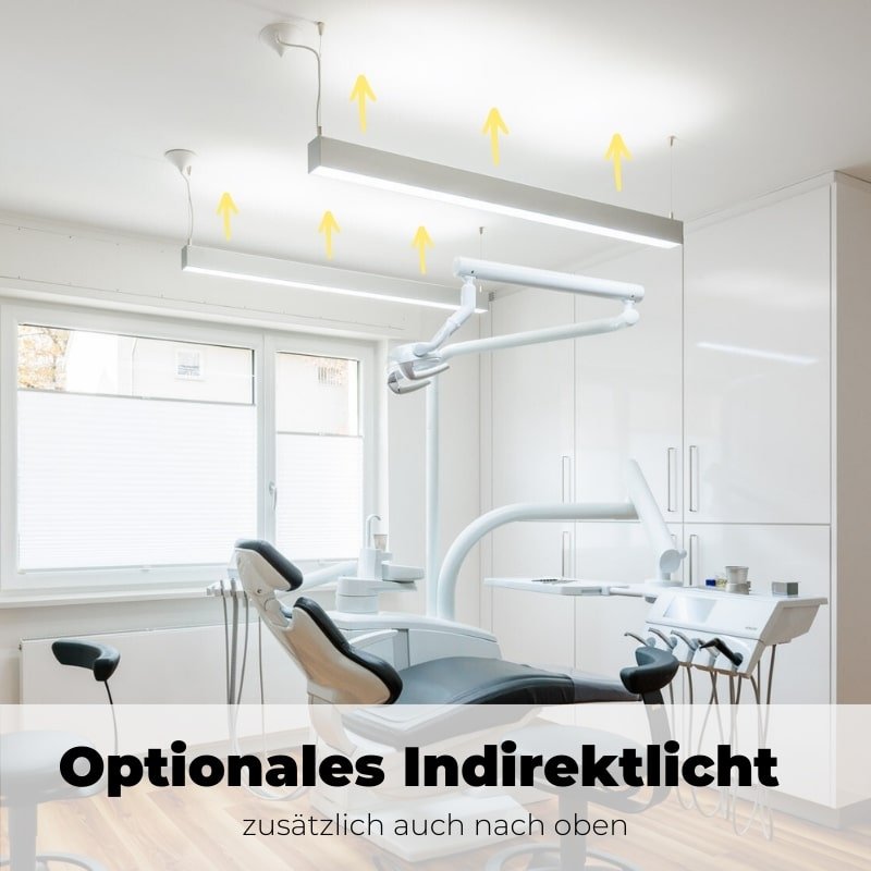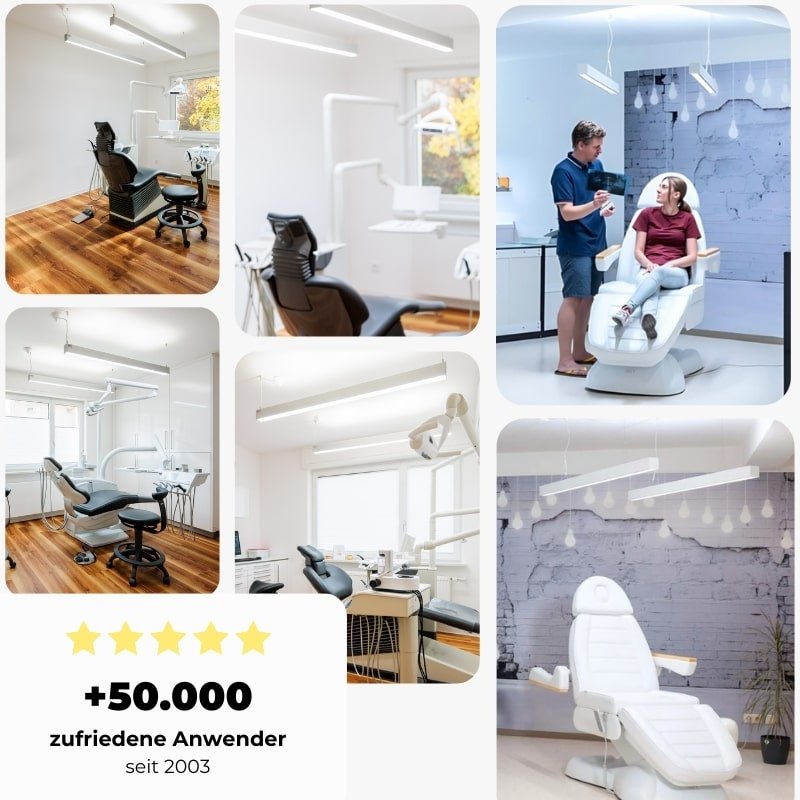 Durch eine klare Formsprache und zeitlosen Farbkomponenten fügen sich unsere Pendelleuchten harmonisch in den Behandlungsraum ein und schaffe eine angenehme Lichtatmosphäre für Patient und Zahnarzt zugleich. Durch die optimale Beleuchtung wird letztendlich der Wohlfühlfaktor des Patienten gesteigert und ein höheres Vertrauen in die Behandlung aufgebaut.