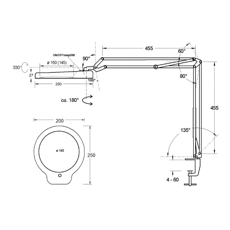 Der optimale Arbeitsabstand zwischen Linse und Objekt ist bei Lupenleuchten mit 3-Dioptrien Vergrößerung in etwa 30 cm. Bei Lupenleuchten mit 5-Dioptrien Vergrößerung empfehlen wir unseren Kunden einen Arbeitsabstand zum Objekt von ca. 18 cm, um kleinste Details im Ausschnitt gut sehen zu können.
