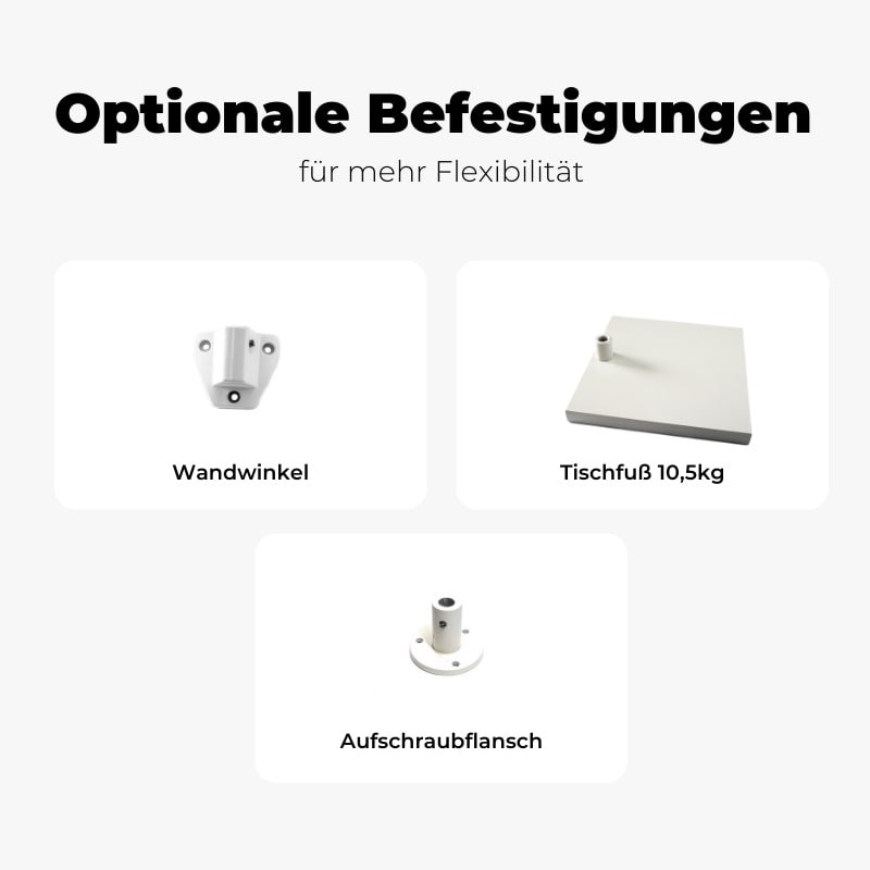 Je nach Anwendungsbedarf gibt es eine Vielzahl unterschiedlicher Befestigungsmöglichkeiten für Ihre RMD Arbeitsplatzleuchte. Zur Auswahl stehen Ihnen dabei: Aufschraubflansch, Tischklemme, Wandhalter und Tischfuß. Machen Sie sich selbst einen Eindruck und sehen Sie unter dem Reiter „Zubehör“ nach, welche Befestigung für Sie und Ihr Modell passend ist.