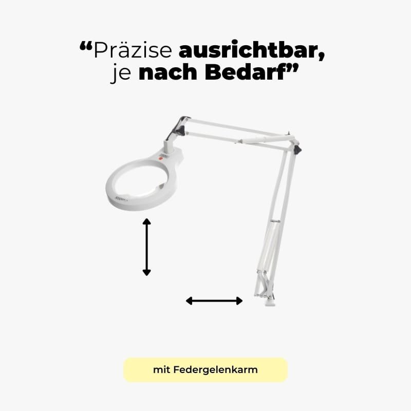 Dank unserer besonders robusten und gleichzeitig leicht verstellbaren Flex- oder Friktionsgelenkarmen bieten unsere Lupenleuchten einen großen Bewegungsspielraum und können individuell entsprechend der Sehaufgabe positioniert werden.