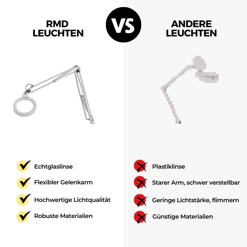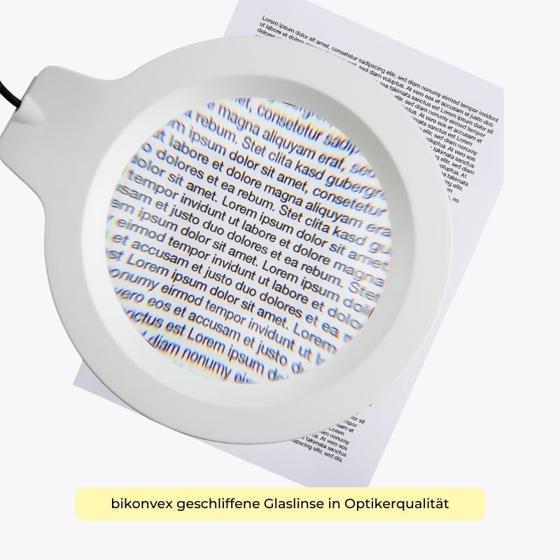 In unseren Lupenleuchten verwenden wir ausschließlich bikonvex geschliffene Glaslinsen in Optikerqualität, also keine optisch minderwertigen Pressglass- oder kratzempfindliche Kunststofflinsen.