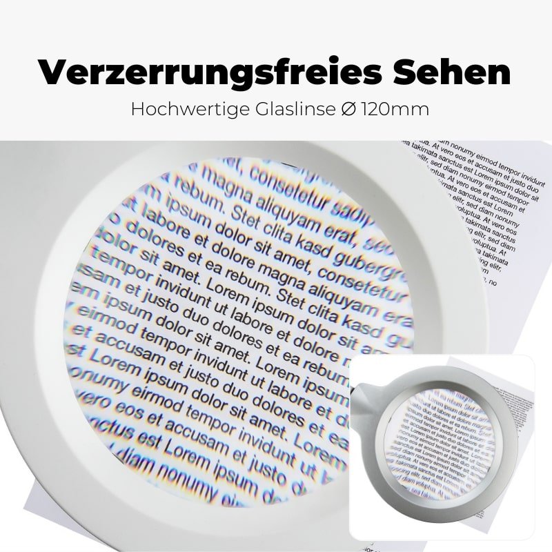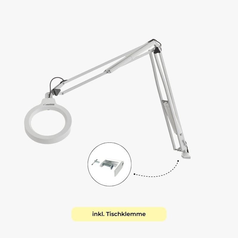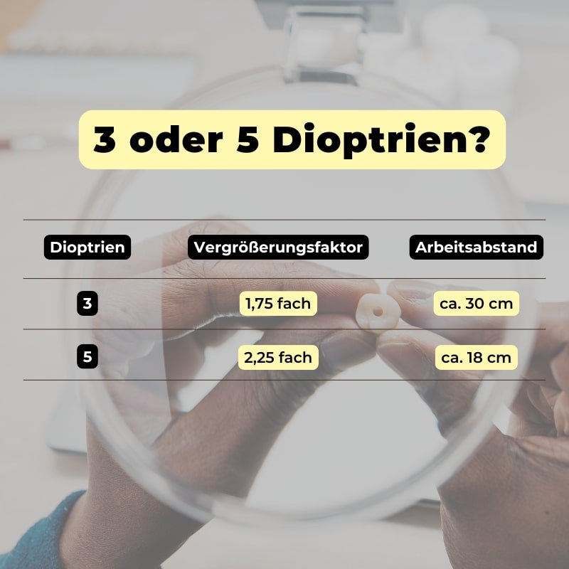 Unsere Erfahrung und das Feedback unserer Kunden zeigte, dass in den meisten Anwendungsbereichen eine Vergrößerung von 3-Dioptrien oder 5-Dioptrien den höchsten Arbeitskomfort bietet. Lupenleuchten mit einem Vergrößerungsfaktor von 3-Dioptrien sind für die meisten gängigen Arbeiten im Bereich von Werkstätten, als Lesehilfe, im zahnärztlichem Sterilisationsraum oder in Dentalpraxen ausreichend und vielseitig einsetzbar. Sie erhalten ein großes Sichtfeld, eine hohe Tiefenschärfe und ein unverzerrtes Bild über die gesamte Linse.