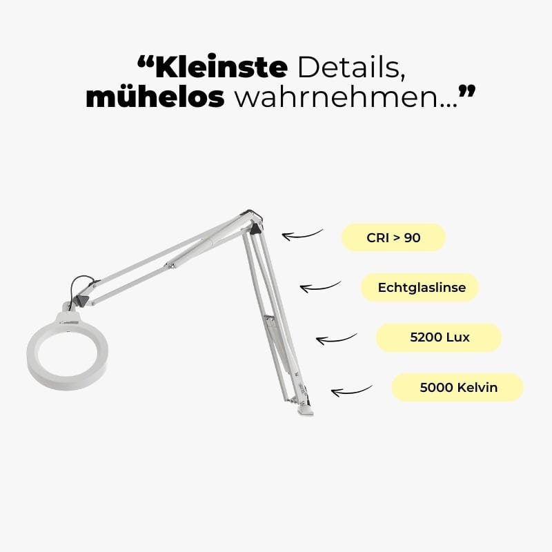 Wer jedoch sehr kleine Details bearbeiten möchten, sollte zu einer Leuchte mit 5-Dioptrien greifen. Mit einer Vergrößerung von 225 % werden auch feinste Objekte gut sichtbar, jedoch verkleinert sich auch das Sichtfeld.