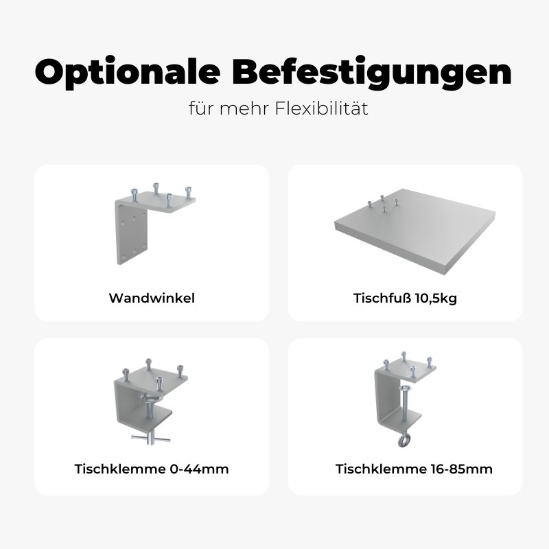 Je nach Anwendungsbedarf gibt es eine Vielzahl unterschiedlicher Befestigungsmöglichkeiten für Ihre RMD Arbeitsplatzleuchte. Zur Auswahl stehen Ihnen dabei: Aufschraubflansch, Tischklemme, Wandhalter und Tischfuß. Machen Sie sich selbst einen Eindruck und entdecken Sie auf der Produkseite die passenden Befestigungen zu der jeweiligen Gelenkleuchte.