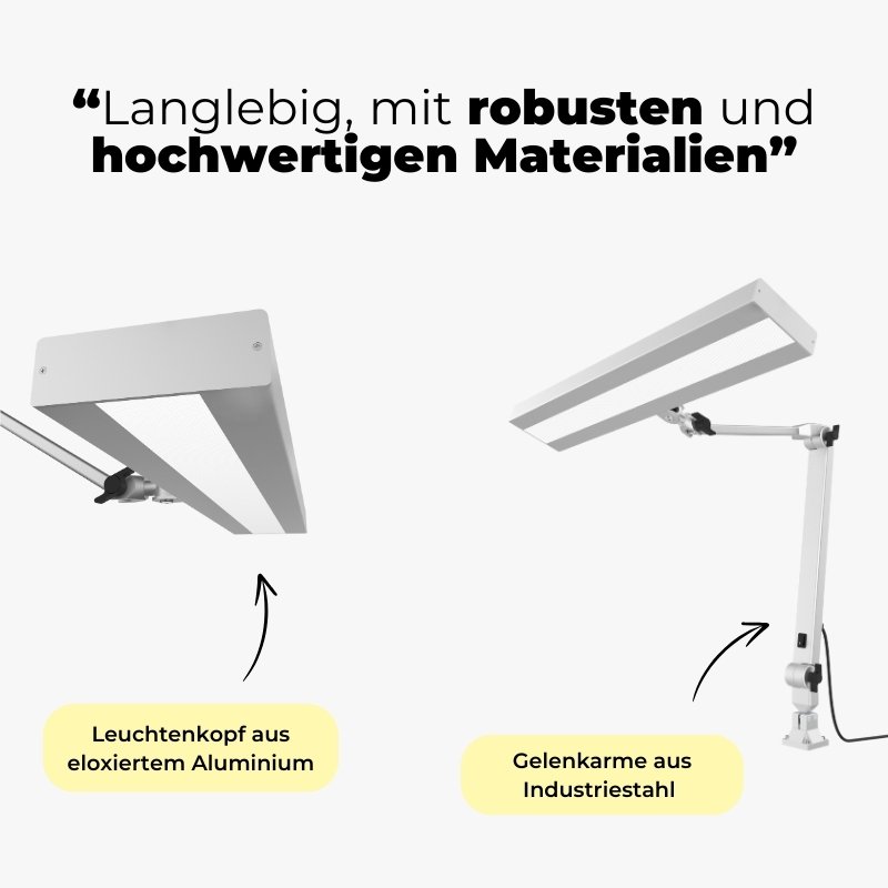 Hochqualitative Bauteile aus natureloxiertem Aluminium vereinen Eleganz und Langlebigkeit. Nicht nur das Leuchten Profil, sondern auch unsere Gelenke sind aus Aluminium gebaut. Im Vergleich zu herkömmlichen Kunststoffgelenken sind diese besonders robust und versprechen eine höhere Lebensdauer der Leuchte.