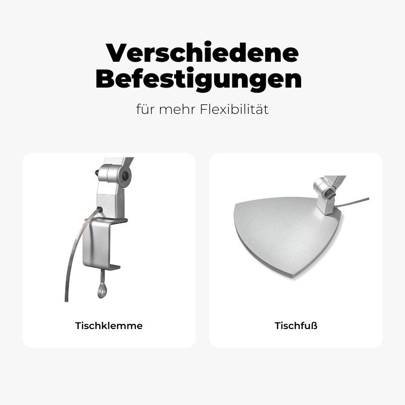 Ergonomisches Licht genau dort, wo es gebraucht wird: Dank vielfältiger Konfigurationsmöglichkeiten und flexibler Befestigungssysteme lässt sich die Tischleuchte nahtlos in jedes Büro- oder Homeoffice-Konzept integrieren – funktional, platzsparend und stilvoll zugleich.