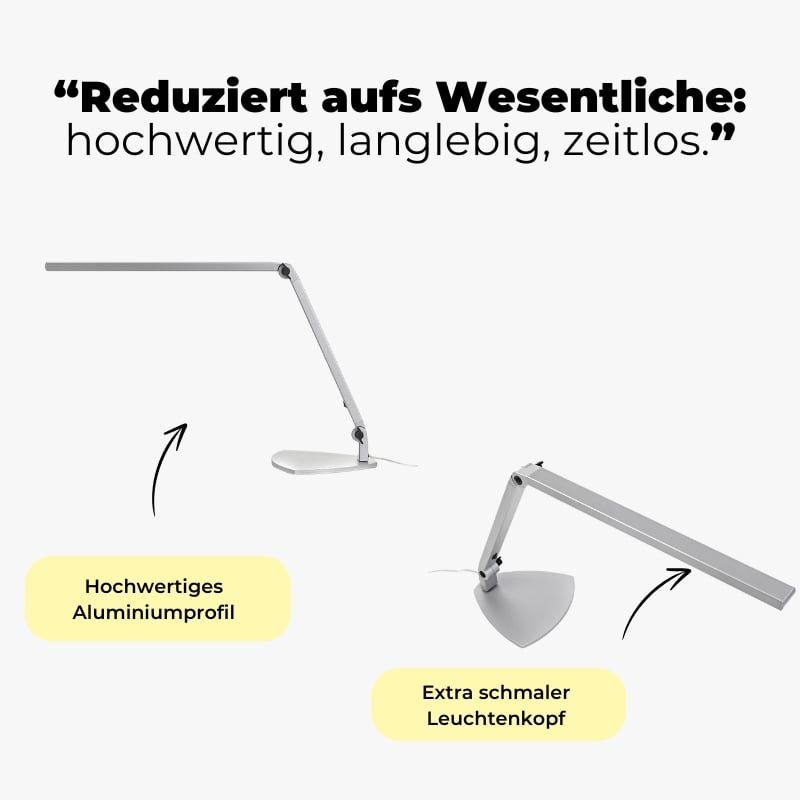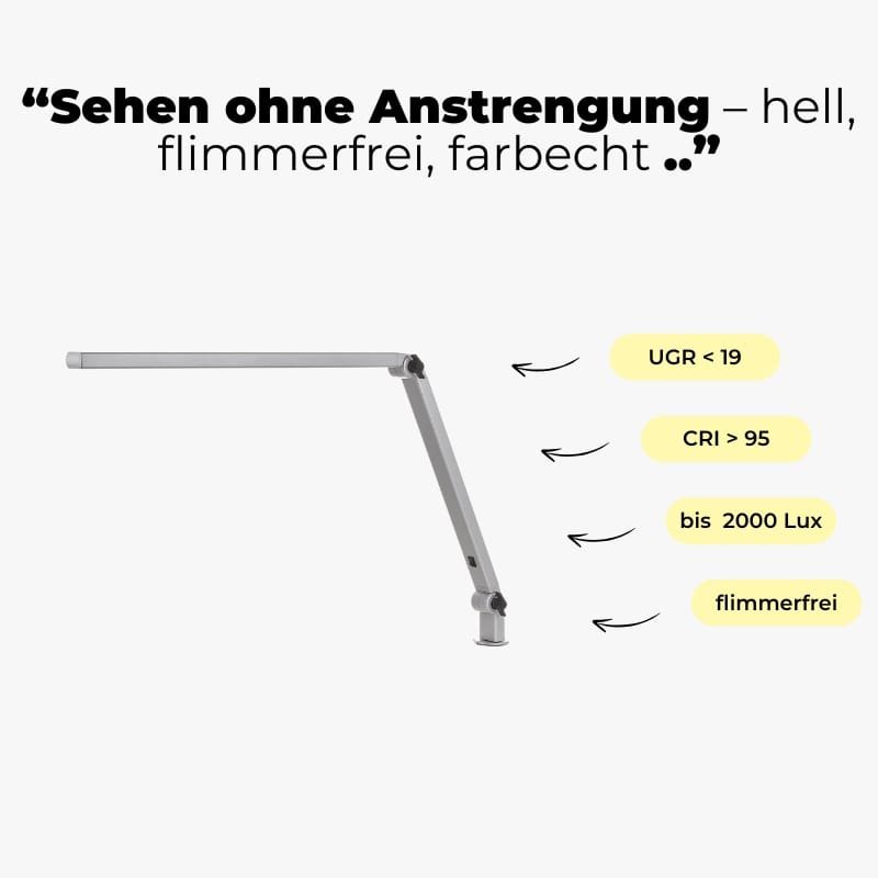 Hochwertige LED-Tischleuchte für blendfreies Licht mit flexibler Befestigung.