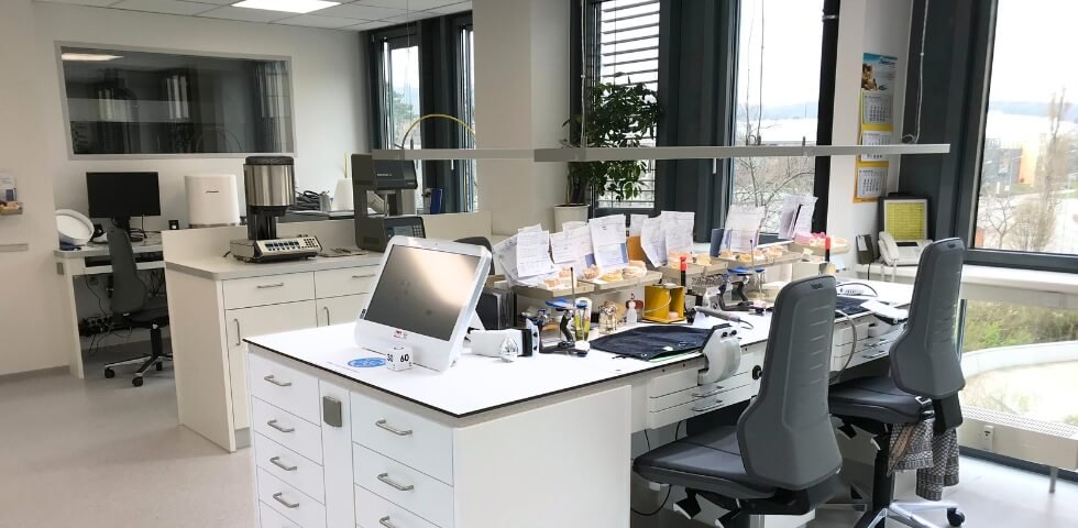 Wer im zahntechnischen Labor arbeitet, braucht scharfe Augen, ruhige Hände – und das beste Licht für präzises Arbeiten. Schließlich sollen die Zahnprothesen nicht nur passgenau gefertigt werden, sondern auch farblich exakt zu den Zähnen des Kunden passen – für ein schönes Lächeln! Für die Beleuchtung in Dentallaboren bedeutet das: hohe Beleuchtungsstärken um 3000 Lux, beste Farbwiedergabe ab CRI 90, tageslichtweiße Farbtemperaturen ab 5300 Kelvin und flimmerfreies Licht, das sich individuell auf die jeweilige Aufgabe einstellen lässt. Anforderungen, die nur mit Spezialleuchten zu erfüllen sind.