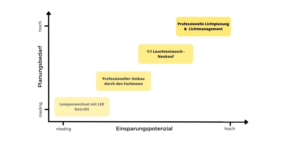 Nicht immer ist ein einfacher Lampenwechsel die wirtschaftlichste Lösung. Gerade angesichts steigender Strompreise sollte eine langfristige Betrachtung von Kosten, Energie und auch Wartung bei der Umrüstung vorgenommen werden. Moderne LED-Beleuchtungssysteme haben heute eine Betriebsdauer von über 50.000 Stunden, daher sollten die oben genannten Faktoren über einen Zeitraum von mindestens 15 Jahren betrachtet werden. Folgende Grafik zeigt die Anforderungen und das Potenzial möglicher Optionen auf.